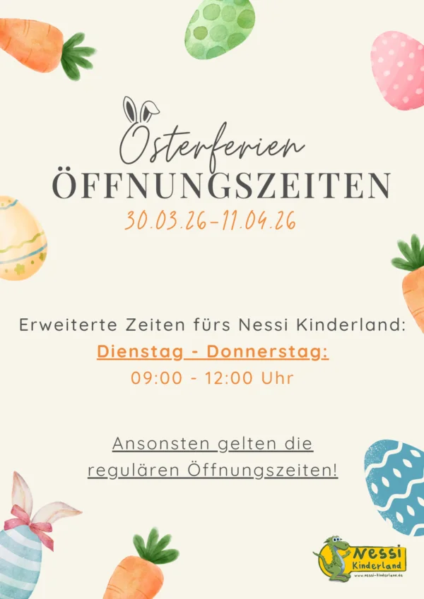 Während der Osterferien in NRW (30. März bis 11. April) ist das Nessi-Kinderland morgens dienstags bis donnerstags von 9:00 bis 12:00 Uhr geöffnet. 🐉😊