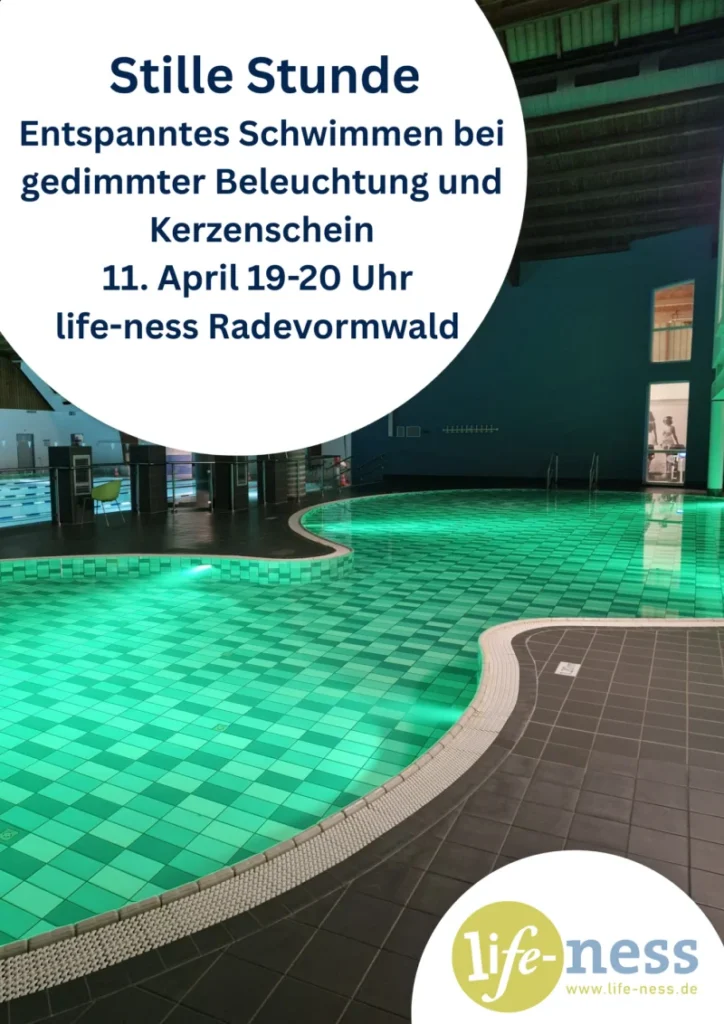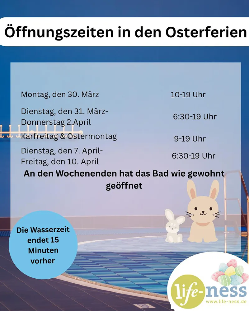 Wir, das Team von life-ness, freuen uns darauf, dich bei uns begrüßen zu dürfen. Unser Ziel ist es, dir einen supertollen Aufenthalt zu bieten, sei es beim Schwimmen in unserem modernen Schwimmbereich oder beim Toben und Spielen im Nessi Kinderland. Unsere Mitarbeiter stehen dir jederzeit mit Rat und Tat zur Seite, um sicherzustellen, dass du eine fantastische Zeit bei uns hast. Wir freuen uns darauf, dich bald beim life-ness und Nessi Kinderland begrüßen zu dürfen!