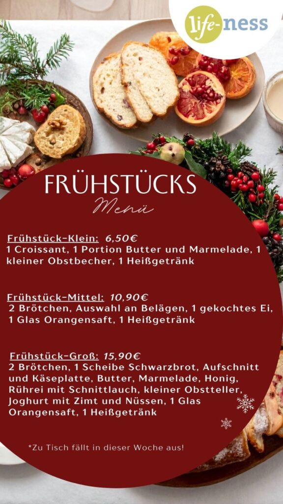 Startet entspannt in den Tag und genießt eine kleine Auszeit im Vital Café – mit liebevoll zubereiteten Frühstücksvarianten und einer warmen, vorweihnachtlichen Atmosphäre.