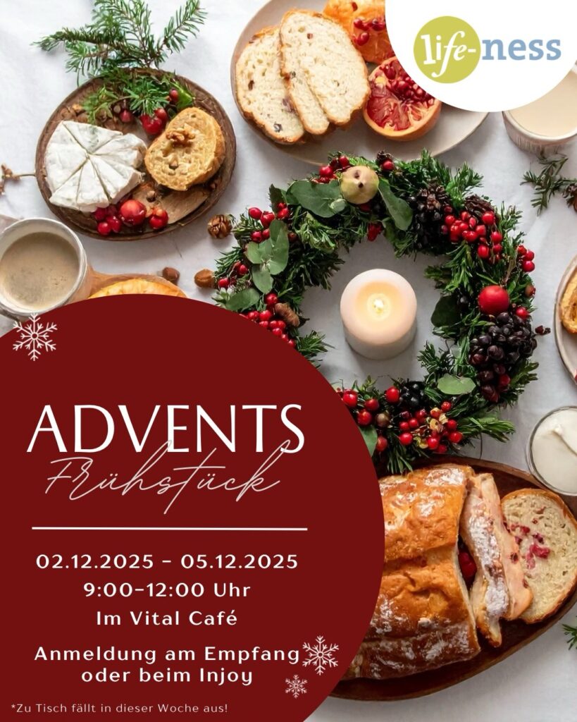 Vom 02.12. bis 05.12.2025 laden wir euch herzlich zu unserem Advents-Frühstück ein.Startet entspannt in den Tag und genießt eine kleine Auszeit im Vital Café – mit liebevoll zubereiteten Frühstücksvarianten und […]